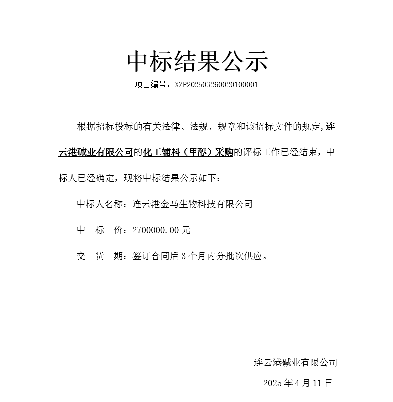 化工輔料(甲醇)采購中標結(jié)果公示