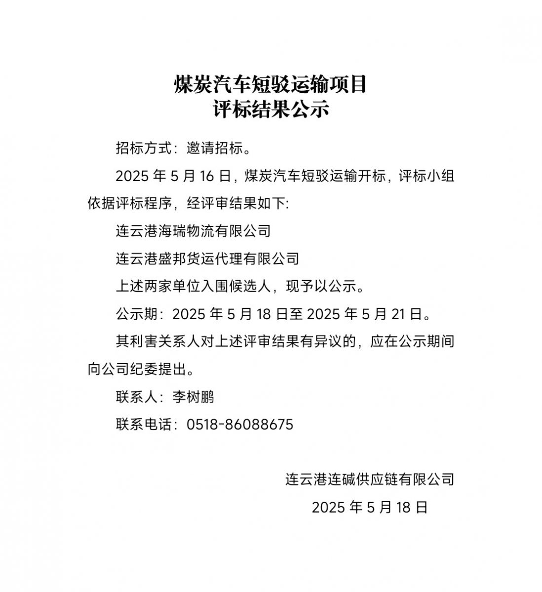 連云港連堿供應(yīng)鏈有限公司煤炭汽車短駁運(yùn)輸項目評標(biāo)結(jié)果公示
