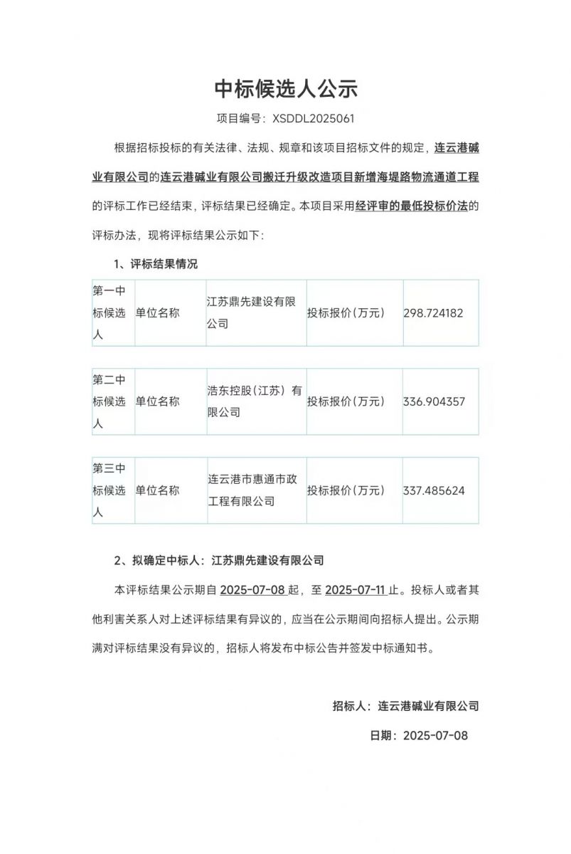 搬遷升級改造項(xiàng)目新增海堤路物流通道工程中標(biāo)候選人公示