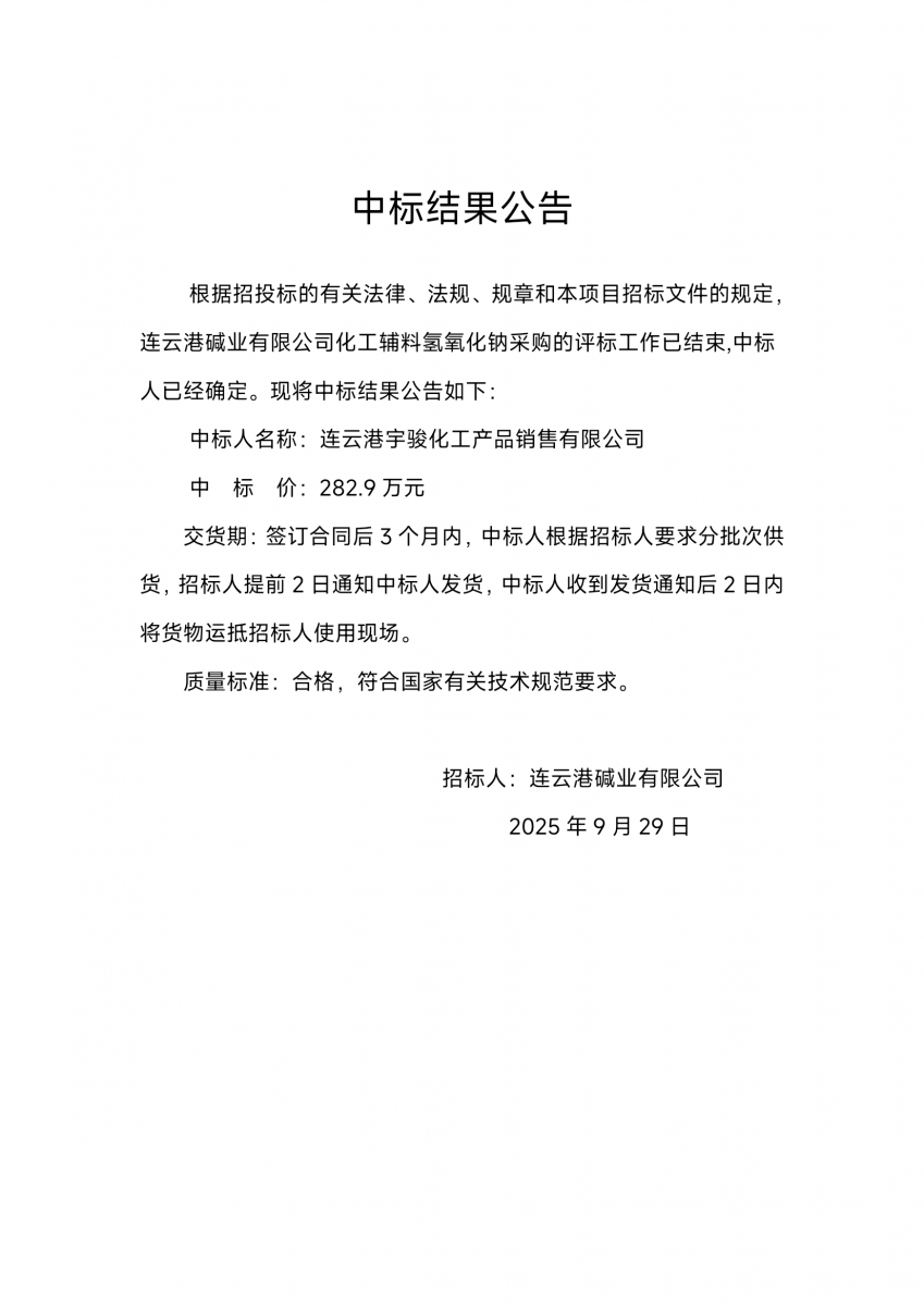 連云港堿業(yè)有限公司化工輔料氫氧化鈉采購(gòu)中標(biāo)結(jié)果公告