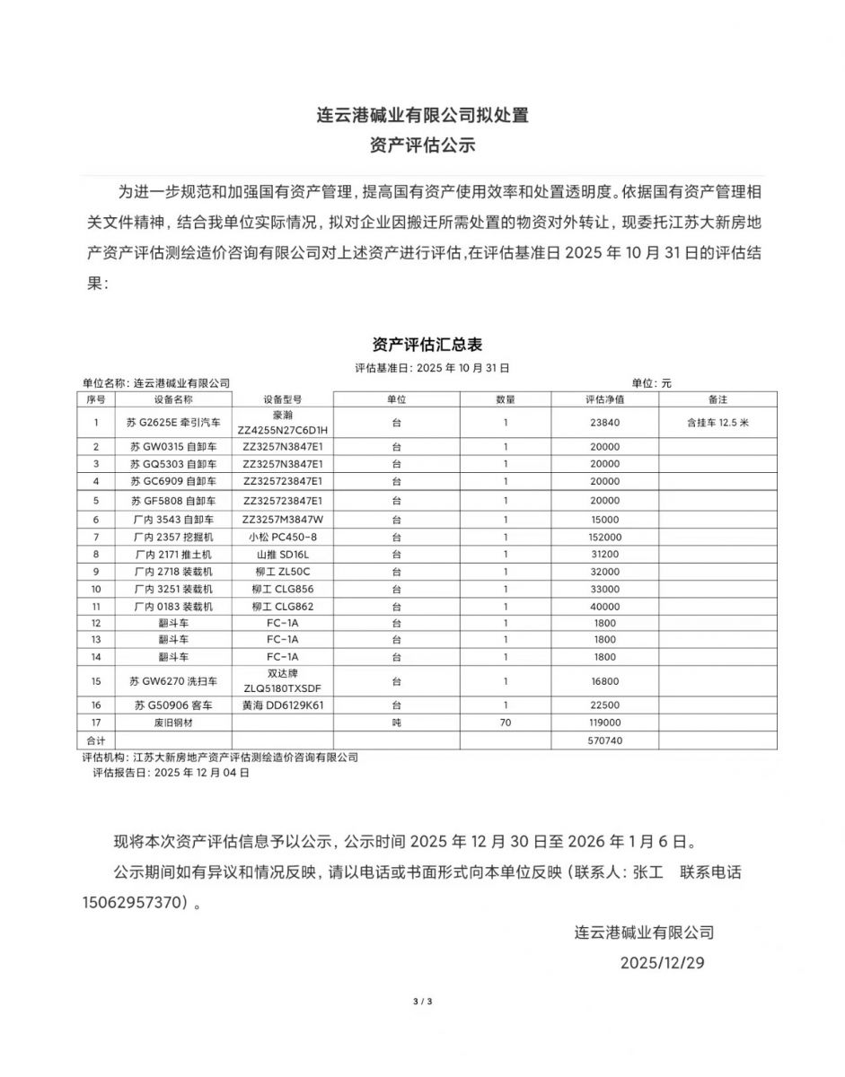 連云港堿業(yè)有限公司廢舊車(chē)輛、鋼材資產(chǎn)評(píng)估公示