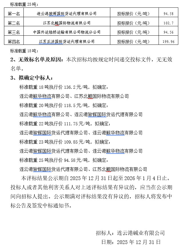 連云港堿業(yè)有限公司外貿(mào)集裝箱貨運代理服務(wù)商招標(biāo)中標(biāo)候選人公示