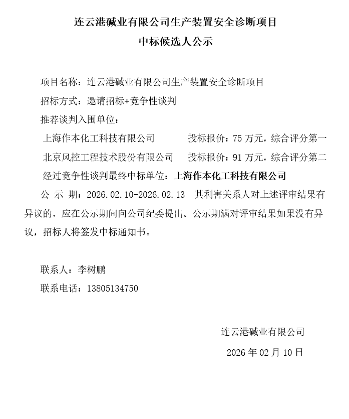 連云港堿業(yè)有限公司生產(chǎn)裝置安全診斷項(xiàng)目中標(biāo)候選人公示