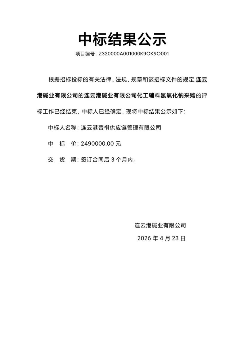 連云港堿業(yè)有限公司化工輔料氫氧化鈉采購(gòu)中標(biāo)結(jié)果公示