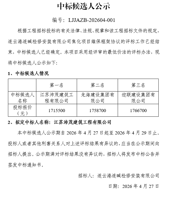 連云港連堿檢修安裝有限公司焦化項(xiàng)目維??蚣軈f(xié)議中標(biāo)候選人公示