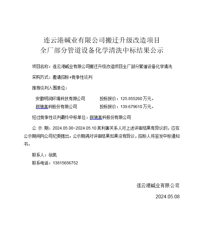 搬遷升級改造項目全廠部分管道設備化學清洗中標結果公示