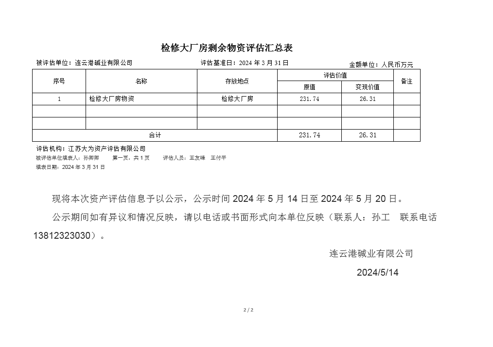 檢修廠房及鋼材庫物資資產(chǎn)評估公示