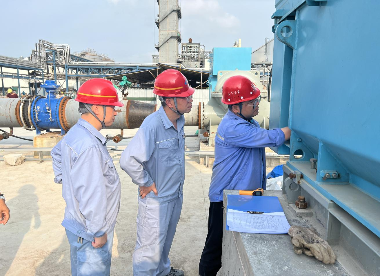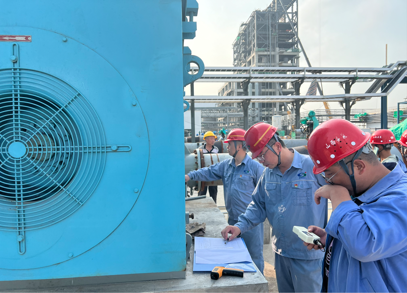 上午11:28,伴隨著“具備條件,啟動電機”指令的發(fā)出,操作人員按下空分循環(huán)水泵P820101A“啟動”開關(guān),電機開始高速旋轉(zhuǎn),隨后操作人員依次開啟P820101B、C??辗盅h(huán)水泵單機試車的現(xiàn)場“熱辣滾燙”,大家衣衫被汗水濕透,但熱情依舊高漲。操作人員每隔15分鐘就詳細(xì)檢查記錄電機的軸溫、轉(zhuǎn)速、振值等指標(biāo)。