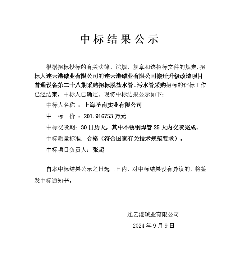 搬遷升級改造項目普通設(shè)備第二十八期采購招標(biāo)脫鹽水管、污水管采購中標(biāo)結(jié)果公示