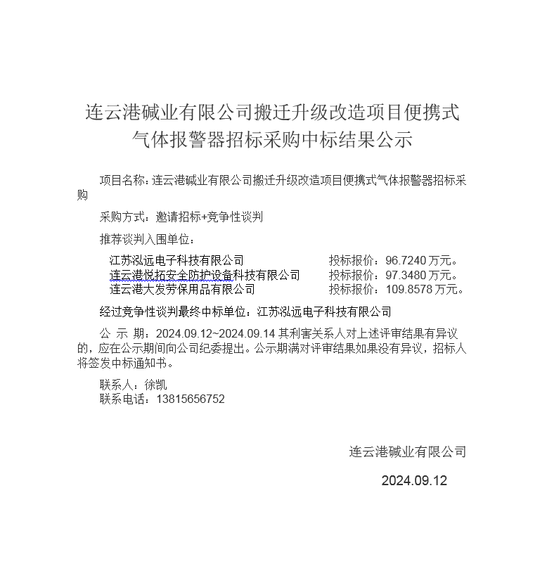 搬遷升級改造項(xiàng)目便攜式氣體報(bào)警器招標(biāo)采購中標(biāo)結(jié)果公示