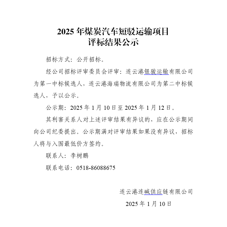 2025年煤炭汽車短駁運輸項目評標結(jié)果公示